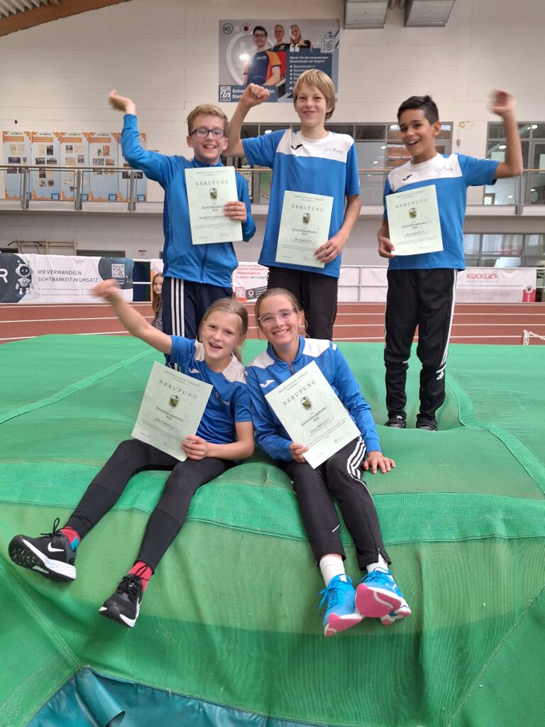 Unsere Leichtathleten des LSV Pirna können auf eine lange und sehr erfolgreiche Freiluftsaison 2025 blicken. Sie absolvierten zahlreiche Wettkämpfe in den verschiedenen Einzeldisziplinen einschließlich Staffelwettbewerben und zeigten ihre Vielseitigkeit in Mehrkämpfen. Dabei erfüllten aus der Trainingsgruppe U12/U14 unsere Sportler Julia, Emma B., Karl, Elias und Ole die in ihrer jeweiligen Altersklasse geforderte 5-Kampfnorm im Mehrkampf (Lauf, Wurf, Sprung, Sprint, Hürde), welche sie dazu berechtigte, zu einem Fähigkeitstest eingeladen worden zu sein. Dieser fand nun am Sonnabend, dem 27. September, in der Dresdner DSC-Halle an der Magdeburger Straße statt. Einzelne Elemente des Testes (Frequenzlauf, Bodenturnen, Aufroller, Sprint- und Sprungfähigkeit, Ausdauer, Wurf) sind Bestandteile unseres vielseitig gestalteten Trainings und doch stieg die Aufregung unserer 5 Athleten zu Beginn des Testes ordentlich. Wollte doch ein jeder von euch zeigen, was in ihm steckt. Ihr habt diese Aufgabe mit viel Ehrgeiz und Willenskraft echt richtig klasse gemeistert und wir dürfen euch ganz herzlich zur Berufung in den Entwicklungskader gratulieren. Mit großer Freude nahmt ihr eure Urkunden vom Nachwuchskoordinator Chris Wetzig an. Wir wünschen allen Sportlern viel Erfolg für die weiteren Wettbewerbe und einen guten Einstieg ins baldige Wintertraining.